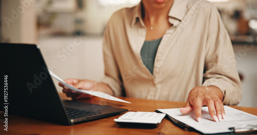 Woman, hands and document in apartment with laptop, calculator and administration for utility bills. Person, paperwork and computer in home with financial planning, household expense and tax return.