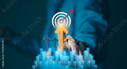 financial success concept, corporate goal achievement, revenue increase strategy, performance analytics, investment growth. Businessman touch digital growth chart with target arrow and rising arrows