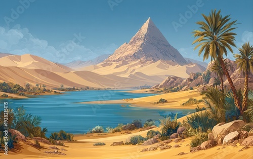 壮大なピラミッド型の山がそびえ立つ砂漠のオアシスを描いた美しいデジタルイラストレーションで、青い湖のほとりにヤシの木が並び、遠くには黄金色の波打つ砂丘と晴れ渡った青空が広がる幻想的で静寂な古代の風景を感じさせる背景素材。