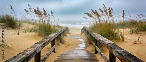 Panoramic view of a weathered wooden boardwalk leading through golden sand dunes with tall sea oats towards a misty ocean beach under a moody overcast sky, peaceful coastal landscape scenery.