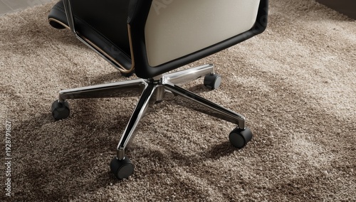 A close-up of a wheeled office chair on a carpet in black and white