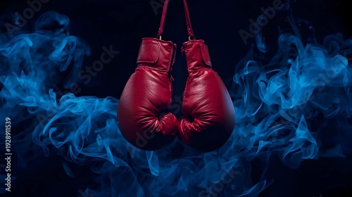 Red leather boxing gloves hang against a dark background, enveloped in swirling, ethereal blue smoke.