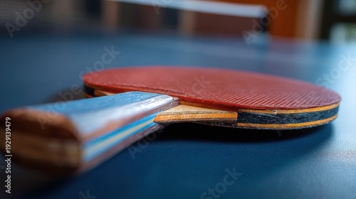 Close-up view of a red and black table tennis paddle's rubber surface and wooden handle