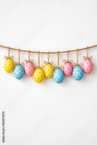 Żółte, niebieskie i różowe jajka pisanki pomalowane w czarne kropeczki.