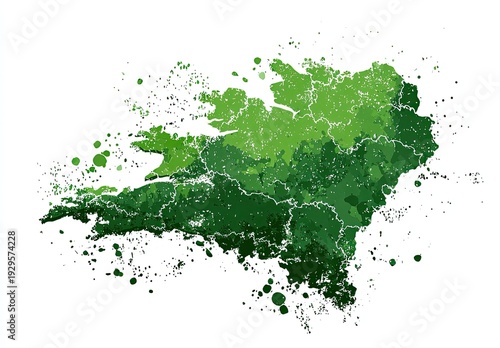 Green map of a landmass, shaded, with splattered effect and white border delineations