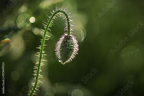 Pąk maku pokryty kroplami rosy w porannym słońcu. Makro ujęcie z podświetleniem i zielonym tłem bokeh. Symbol budzącego się życia, świeżości i delikatności natury.