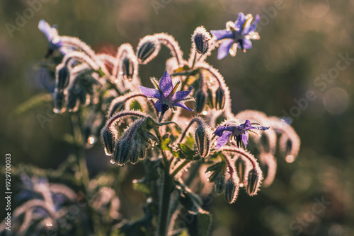 Fioletowy kwiat ogórecznika pokryty rosą w świetle poranka. Makro zbliżenie z efektownym bokehem. Delikatność natury, motyw ziołolecznictwa i ekologicznego ogrodu miododajnego.