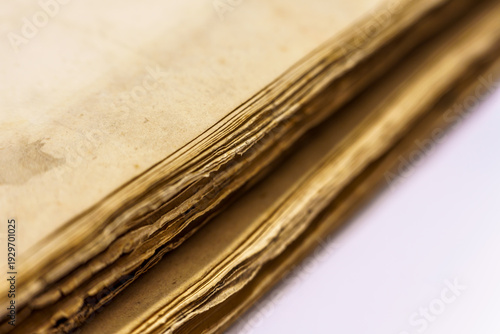 Makro zbliżenie na róg starej, pożółkłej księgi lub stosu archiwalnych dokumentów. Widoczne tekstury zniszczonego papieru i warstwy historii. Antyczny, vintage styl na białym tle.