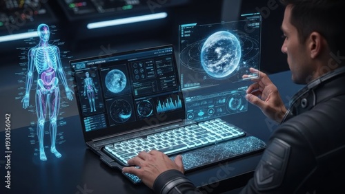 A man using a laptop with a holographic display of a human body and the Earth.