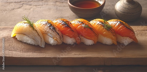 Cinque pezzi di nigiri sushi con pesce fresco su tagliere di legno rustico, pronto per essere gustato.