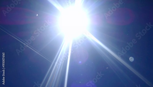Raggi di luce solare intensa e brillante con effetto flare su sfondo blu scuro, concetto di energia.