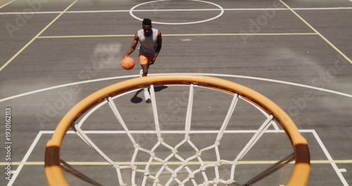 Fitness, basketball and man on outdoor court for training, match or workout with hoop for dunk. Sports, athlete and male person with energy for practice, game or exercise with cardio for competition.