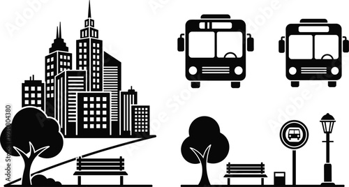 Vector Silhouette Icon Set of City Skyscrapers Public Bus Stop Bench Street Lamp and Urban Park Elements Isolated on White