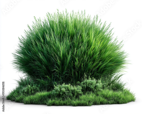 Szczegółowa, realistyczna kępa gęstej, zielonej trawy z małymi krzewami u podstawy. Całość wyizolowana na czystym, białym tle. Natura.