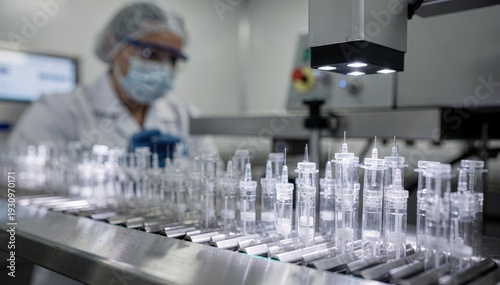 Semiautomatic inspection line showing a close view of syringes being scanned for imperfections by automated sensors while an operator monitors the process.