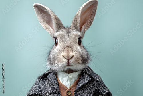 Rabbit dressed in a suit with a bow tie stands against a plain blue background