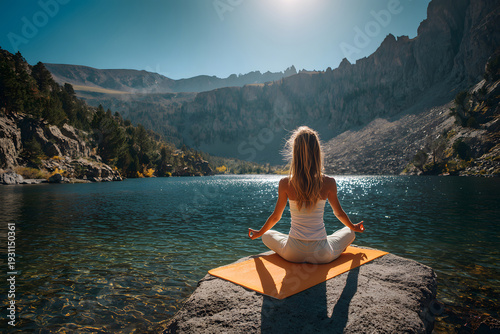 Woman practices yoga by a lake in the mountains during the daytime with clear blue skies above