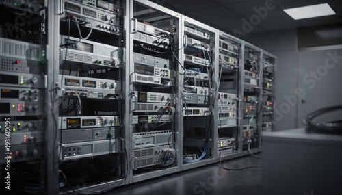 Dynamic medium shot of structured spacious racks filled with broadcast transmitters and supporting equipment subdued lighting creating a technical immersive feel.
