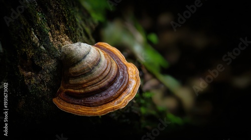 Detailed Bracket Fungus Growing on Tree Bark in a Dark Forest Environment