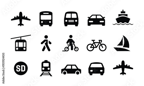 Public Transportation Icon Set, Minimal Flat Transport Symbols For Bus Train Metro Tram And Taxi, Urban Travel And Mobility Graphic Collection, Modern Vector Illustration For Navigation.