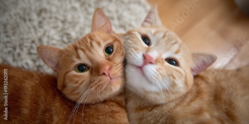 Dwa urocze rude koty leżące blisko siebie z głowami przytulonymi do siebie, patrzące prosto w obiektyw aparatu w przytulnym domu.