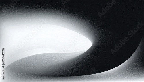 Abstrakcyjne czarno-białe tło z ziarnistą teksturą przedstawiające płynne krzywe i dynamiczne przejścia tonalne w minimalistycznym stylu.