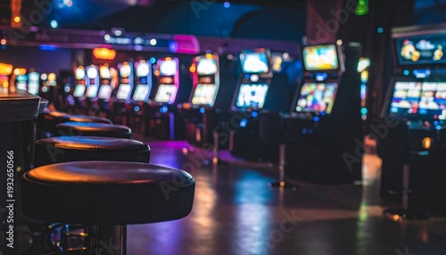 Wnętrze nowoczesnego kasyna z rzędami automatów do gier i hokerami barowymi oświetlone neonami w nocy tworzy atmosferę hazardu i emocji.