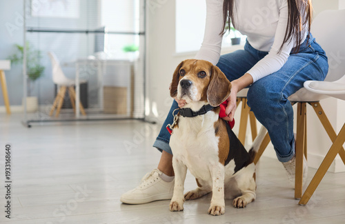 Dog beagle with owner waiting at clinic. Cropped view of a woman steadying her pet before veterinarian checkup and appointment in the office in a clean setting. Pet care concept made clear.