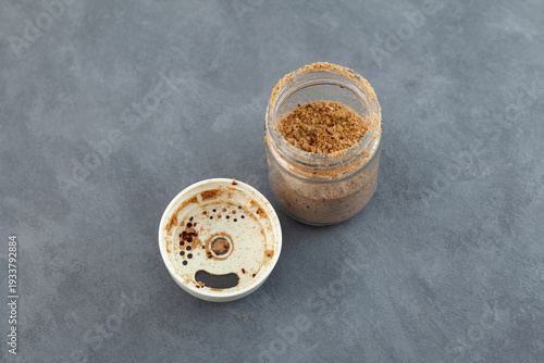 Tribolium castaneum. Rust-red flour beetle or Red grain beetles. Stored food pests. Problem of Contamination by insects. Pantry pests, kitchen bugs. Infested spice jar