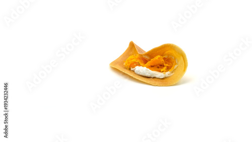 Khanom Bueang is a traditional Thai dessert that has existed since ancient times believed to have originated during the Sukhothai period. It consists of a flat sheet of batter as its main ingredient.