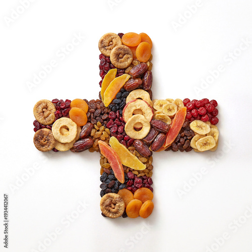 Znak plus utworzony z różnych gatunków suszonych owoców na białym tle