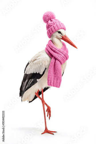 Bocian biały w różowym szaliku i czapce stoi na jednej nodze na białym tle