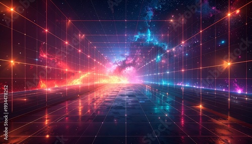 reticolato formato da linee e punti che formano una struttura rettangolare e che si estendono su uno spazio cosmico colorato, astratto e di fantasia