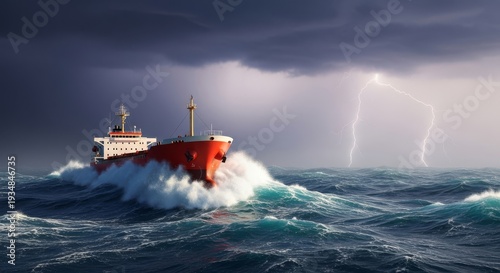 A powerful cargo vessel navigates an intensely stormy ocean, waves crashing dramatically over its bow, showcasing resilience and nature's force, vessel, battle, weather