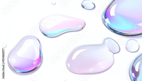 Zbliżenie na krople cieczy o opalizujących, pastelowych refleksach na białym tle, abstrakcyjna tekstura.