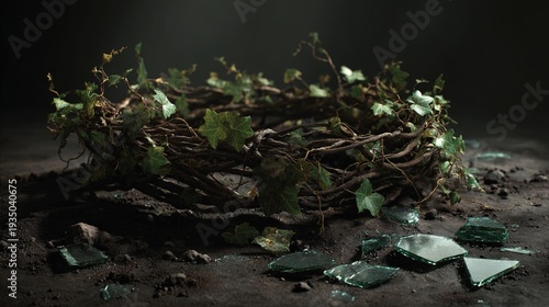 dominion. A crown of grapevines and ivy on dark soil with broken glass shards. event programs, museum guides, designed for cultural heritage projects and event programs, preserves heritage.