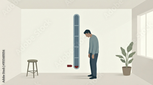 Low motivation concept: tired person beside near-zero meter, fatigue exhaustion low energy workday slowdown limit acceptance pace