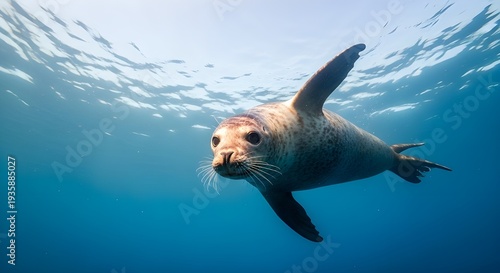 A seal swims underwater with its flippers outstretched in a clear blue ocean.