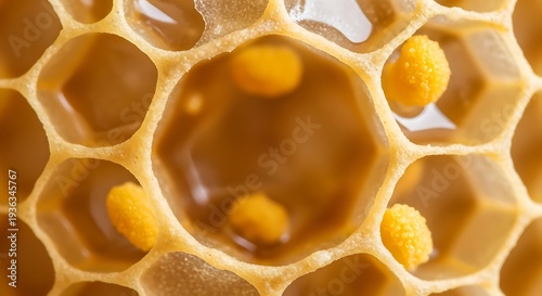 Extreme macro of fresh honeycomb cell walls thin wax translucent with pollen grains, golden geometric