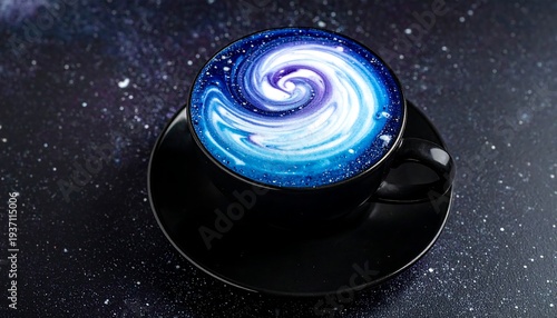A black cup with foam art resembling a galaxy on a speckled, dark-blue background