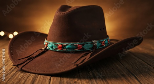 Rustic Cowboy Hat on Wooden Table: A vintage brown cowboy hat, adorned with a decorative turquoise band and chin strap, rests elegantly on a weathered wooden table.
