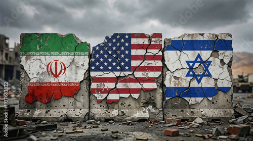 Iran, USA, and Israel flags painted on three separate cracked concrete war barrier slabs in destroyed city rubble.