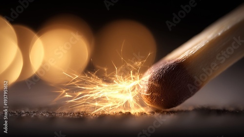 Close-up macro shot of a match striking and creating bright sparks with bokeh lights in the background