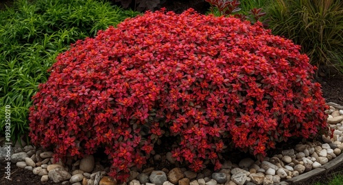 Autumn sedum in vibrant bloom with thick garden greenery and assorted decorative stones