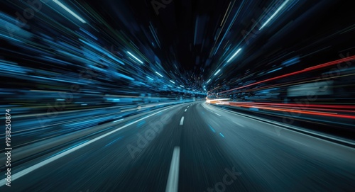 Blurred digital information flow over road demonstrating speedy innovation and transformation
