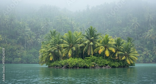 Copy space with vibrant palm forest on a motu in rainy atmosphere