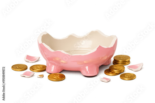 Broken pink piggy bank with gold coins and ceramic shards, symbolizing debt, bankruptcy, and failed personal savings