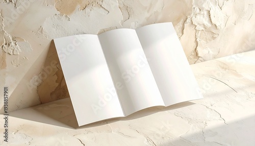 A tri-fold brochure stands open on a marble surface against a textured wall, showcasing empty pages from a slight overhead viewpoint.