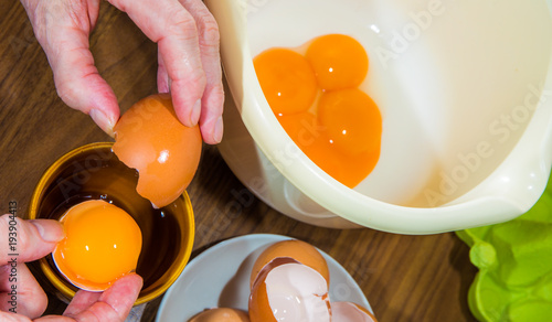 eine Frau schlägt Eier auf und gibt sie in eine Schüssel
