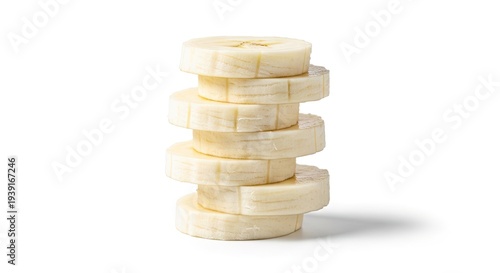 A stack of sliced bananas is arranged vertically on a white surface. The banana slices are neatly stacked, showcasing their curved shapes and creamy texture.